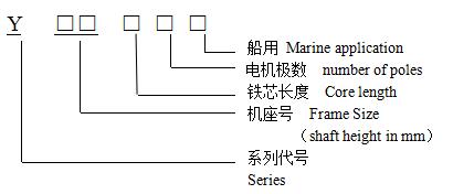 Y-H系列船用三相异步电动机(机座号80~355) Y-H Series Three phase Marine Asynchronous Motor(Frame Size80~355) 产品概述(Product Overview) Y—H系列为全封闭,自扇冷式,船用三相鼠笼式异步电动机,适用于船舶上作驱动各种机械,如泵类、通风机、分离器、液压机械及其它辅助设备等之用。 Y—H Series are totally-enclosed,fan-cooled three-phase marine asynchronous motors of squirrel caged type.The motors are suitable for driving various machines on ships such as pumps,blowers,separators,hydraulic engines and other auxiliary equipment. 工作环境条件(Operating Conditions) 海拔≤1000m Altitude should be lower than 1000m above sea level 环境温度:0~+45℃ Ambient temperature 0~+45℃ 空气相对湿度≤95% Relative humidity should be less than 95%. 倾斜:±30° Inclination:±30° 摇摆:±22.5° Swing:±22.5° 有盐雾、油雾、霉菌及海水的影响 Influenced by Dew、Salt mist、Oil mist、Fungus and sea water. 有船舶和近海装置正常营运和作业中产生的冲击、振动的影响 Influenced by shock and vibration come from ships and offshore installation. 型号说明(Type Designation)