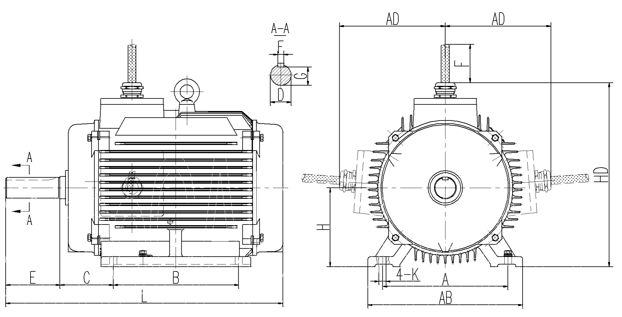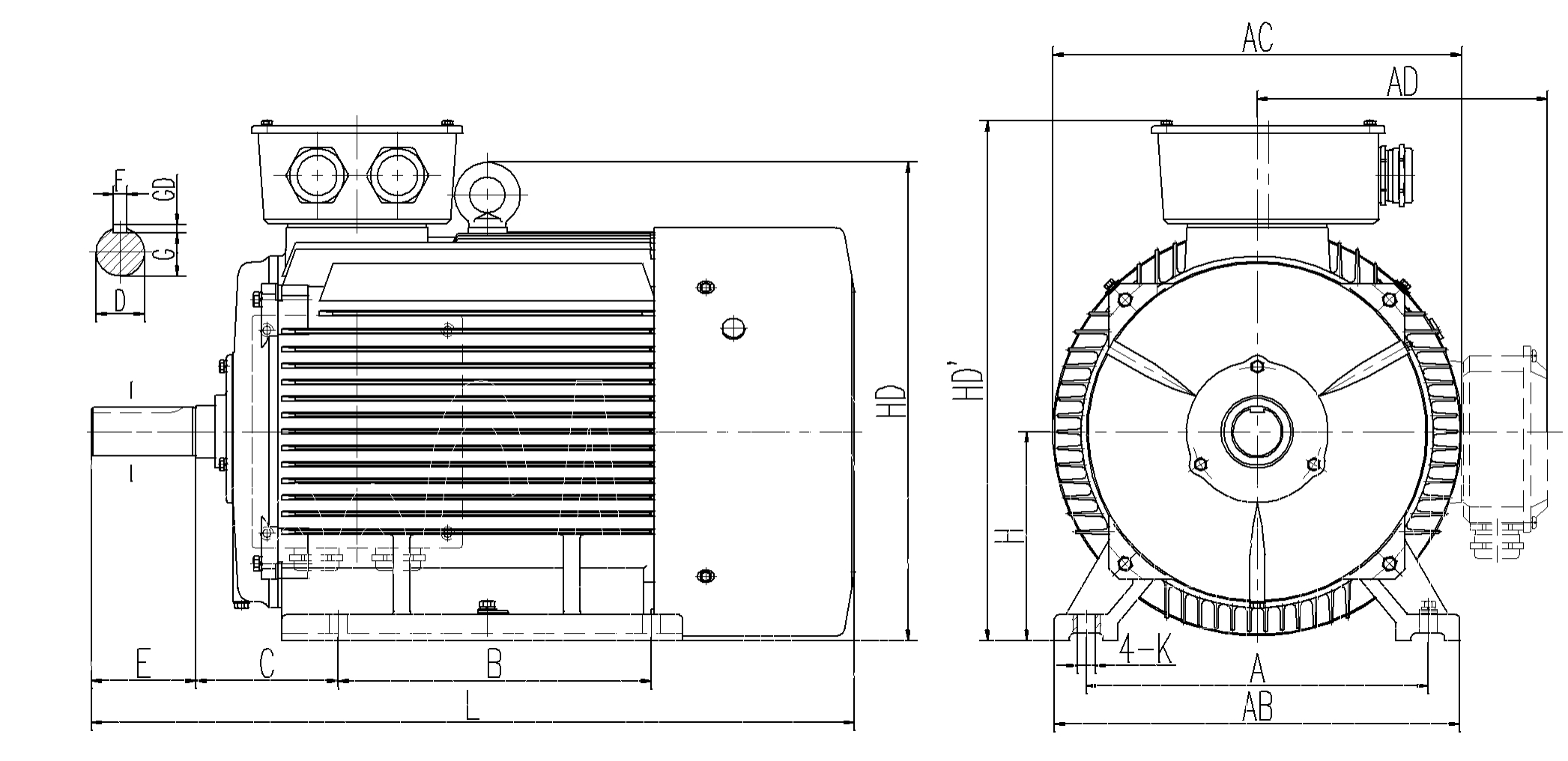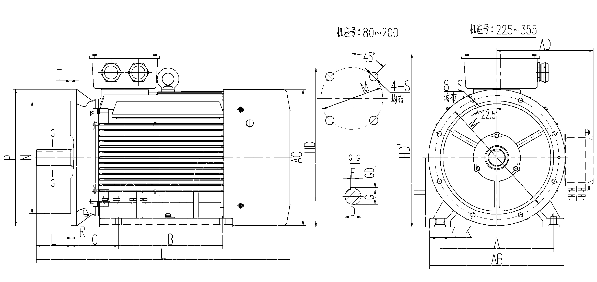无后轴底脚安装式B3 without shaft-extension on NDE and foot mounted type B3 机座号 Frame Size | 安装及外形尺寸 Mounting and overall dimensions | | A | B | C | D | E | F | G | GD | H | K | AB | AD | HD | L | | 80M | 125 | 100 | 50 | 19 | 40 | 6 | 15.5 | 6 | 80 | 10 | 165 | 135 | 225 | 265 | | 90S | 140 | 56 | 24 | 50 | 8 | 20 | 7 | 90 | 180 | 145 | 240 | 275 | | 90L | 125 | 305 | | 100L | 160 | 140 | 63 | 28 | 60 | 24 | 100 | 12 | 205 | 162 | 265 | 335 | | 112M | 190 | 70 | 112 | 245 | 175 | 290 | 365 | | 132S | 216 | 89 | 38 | 80 | 10 | 33 | 8 | 132 | 280 | 195 | 335 | 430 | | 132M | 178 | 468 | | 160M | 254 | 210 | 108 | 42 | 110 | 12 | 37 | 160 | 15 | 330 | 235 | 385 | 560 | | 160L | 254 | 605 | | 180M | 279 | 241 | 121 | 48 | 14 | 42.5 | 9 | 180 | 355 | 265 | 435 | 618 | | 180L | 279 | 658 | | 200L | 318 | 305 | 133 | 55 | 16 | 49 | 10 | 200 | 19 | 395 | 285 | 475 | 695 | | 225S | 356 | 286 | 149 | (55)/60 | (110)/140 | (16)/18 | (49)/53 | (10)/11 | 225 | 435 | 315 | 515 | 725 | | 225M | 311 | 750 | | 250M | 406 | 349 | 168 | (60)/65 | 140 | 18 | (53)/58 | 11 | 250 | 24 | 490 | 325 | 580 | 815 | | 280S | 457 | 368 | 190 | (65)/75 | (18)/20 | (58)/67.5 | (11)/12 | 280 | 550 | 355 | 635 | 875 | | 280M | 419 | 920 | 注/Note:1.图中 F尺寸根据用户提供要求;the dimension F could be made according to customer's required; 2.表格中括号内的数字为2极数据。The data in bracket refer to 2 poles motors. |